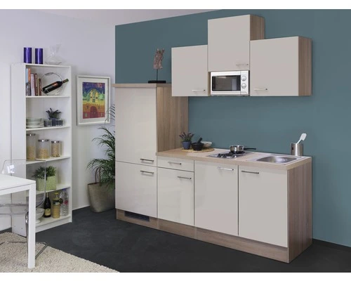 Maar ook de functionaliteit wordt niet verwaarloosd: alles wat in een keuken nodig is, is samengevoegd in een ruimte van 210 cm. Op de tweepitskookplaat met snelkookzones kunnen snel lekkere maaltijden bereid worden en in de 40×50 cm grote roestvrijstalen gootsteen is ook de afwas geen probleem meer. De geïntegreerde 700 W magnetron met 6 standen en een praktische ontdooifunctie is een extra highlight. Drie 50 cm brede bovenkasten en een 50 cm brede onderkast met lade, elk met legplanken bieden genoeg opbergruimte voor de kleine huishouding. In de kast bevindt zich een hoog ingebouwde koelkast met 4-sterren vriesvak. Ook de 100 cm brede gootsteenkast en de kast onder de koelkastnis bieden nog genoeg plek, bijv. voor voorraad en poetsspullen. Om de indeling van je keuken voor je te vereenvoudigen zijn de kastdeuren zowel voor links- als rechtszijdige montage geschikt.