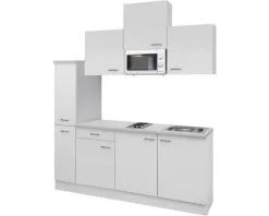 | Kenmerk | Het werkblad wordt geleverd zonder uitsparing, waardoor de spoelbak flexibel te monteren is. De keuken kan ook in spiegelbeeld worden geïnstalleerd. Alle onderdelen (bouwplanken, boven- en onderplanken) worden geleverd in het wit. Kooktoestelaansluitkabel, kraan en sifon dienen worden niet meegeleverd. |