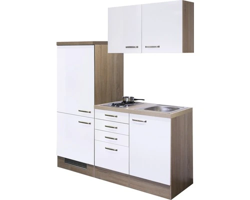 Maar ook de functionaliteit wordt niet verwaarloosd: alles wat in een keuken nodig is, is samengevoegd in een ruimte van 160 cm. Op de tweepitskookplaat met snelkookzones kunnen snel lekkere maaltijden bereid worden en in de 40×50 cm grote roestvrijstalen gootsteen is ook de afwas geen probleem meer. In de kast bevindt zich een hoog ingebouwde koelkast met 4-sterren vriesvak. Een 100 cm brede bovenkast met 2 deuren en legplank en een 50 cm brede onderkast met 4 lades bieden genoeg opbergruimte voor de kleine huishouding. Ook de 50 cm brede gootsteenkast en de kast onder de koelkastnis bieden nog genoeg plek, bijv. voor voorraad en poetsspullen. Om de indeling van je keuken voor je te vereenvoudigen zijn de kastdeuren zowel voor links- als rechtszijdige montage geschikt.
